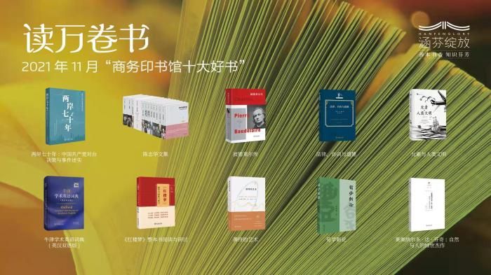2021年11月“商務印書館十大好書”8日晚在直播間發布,《兩岸七十年:中國共產黨對臺決策與事件述實》《陳志華文集》《波德萊爾傳》《法律、自由與道德》《元素與人類文明》《牛津學術英語詞典(英漢雙語版)》《<紅樓夢>整本書閱讀與研討》《善終的藝術:應對衰老、病痛、死亡的實用指南》《荀學新論》《萊奧納爾多·達·芬奇:自然與人的驚世杰作》入選。