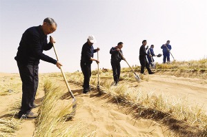 沒(méi)有治沙經(jīng)驗(yàn),他們就按“一步一叩首,一苗一瓢水”的土辦法栽種樹(shù)苗。然而,要想在沙漠中種活一棵樹(shù)談何容易?第一年,“六老漢”造林1萬(wàn)畝,轉(zhuǎn)過(guò)年一開(kāi)春,一場(chǎng)大風(fēng)過(guò)后,六七成的樹(shù)苗沒(méi)了。在林業(yè)技術(shù)人員的指導(dǎo)下,“六老漢”重拾信心,總結(jié)出“一棵樹(shù),一把草,壓住沙子防風(fēng)掏”的治沙經(jīng)驗(yàn)。慢慢地,樹(shù)苗的成活率上去了,漫天黃沙中顯現(xiàn)出點(diǎn)點(diǎn)滴滴的綠。