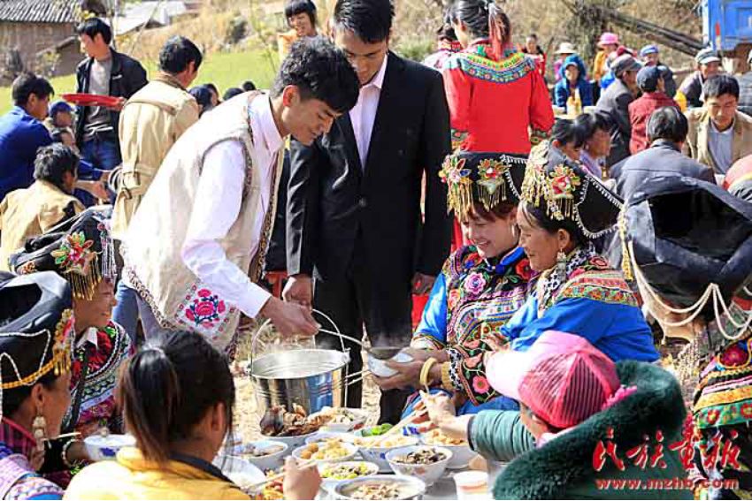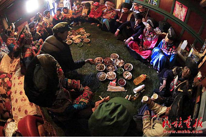 穿長衫,戴著包頭的新郎,把新娘接入正堂屋,將送親的人群迎進(jìn)臨時搭建的青棚屋休息。青棚,是傈僳族人辦婚事時砍來毛櫟樹、香樹枝等臨時搭起的棚子。既清新又涼爽舒適。可以用來接待賓客,也可以作為跳舞、唱曲子的活動場所。晚餐就在青棚里進(jìn)行,宴席一般不用桌子,酒菜擺在青棚下面鋪好青松毛的地上,客人八個一圈,席地坐在青松毛上,圍著喜筵,既歡樂又開心的喝著美酒、品嘗佳肴。晚飯菜肴十分豐盛,足見主人家的好客和廚師的高超手藝。菜出雙不出單,菜的顏色出紅不出白。一切都象征著成雙成對,吉祥如意。