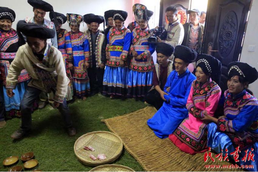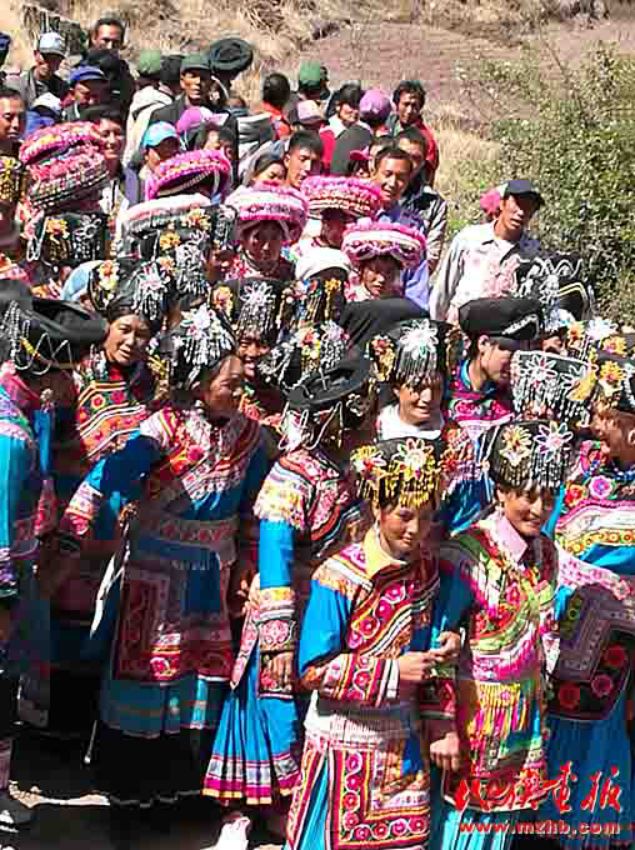 娶親要請客,當(dāng)?shù)乩圩逭埧椭恍杩陬^傳話,凡是知道的親戚朋友都會來參加。娶親隊(duì)伍主次兩位主婚人,伴郎伴娘各一人,背新娘和嫁妝的二人,接親的四至六人,其中有一至兩個歌手,一行十二人組成。帶著早已為新娘準(zhǔn)備好的花短衣、長裙、銀手飾、圍腰鏈、銀泡、銀項(xiàng)等飾物興高采烈地從新郎家出發(fā)。