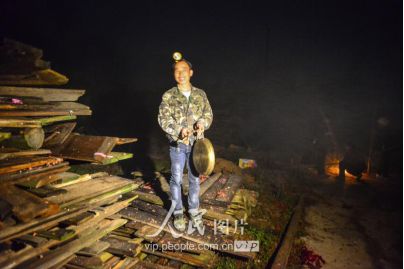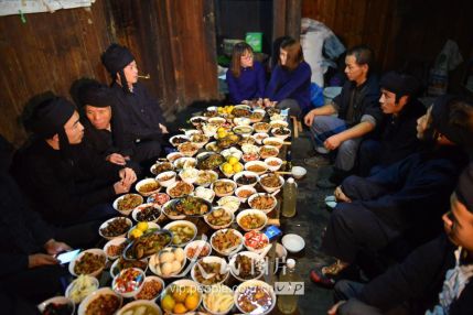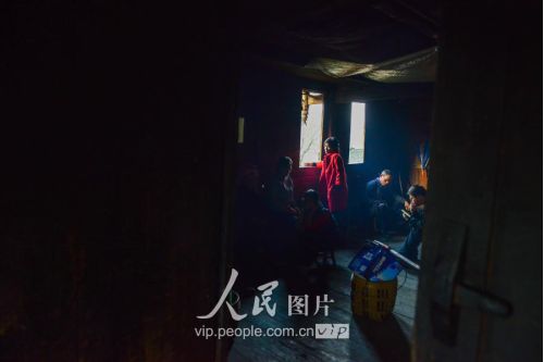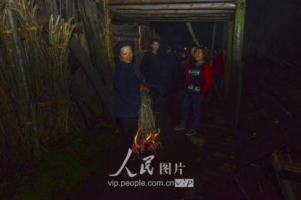 一般要到快過春節的時候,男方家才專門請人去接女方來洗糯米、打糍粑,新娘方能在夫家住上一夜;在來年農忙時節,又接女方來幫忙,夜里仍不能在男方家留宿,幫完忙當晚即回去,只有待到女方有身孕后,新娘才到夫家長住。圖為11月16日夜,新娘潘芝銀家為準備婚禮,燈火徹夜長明。