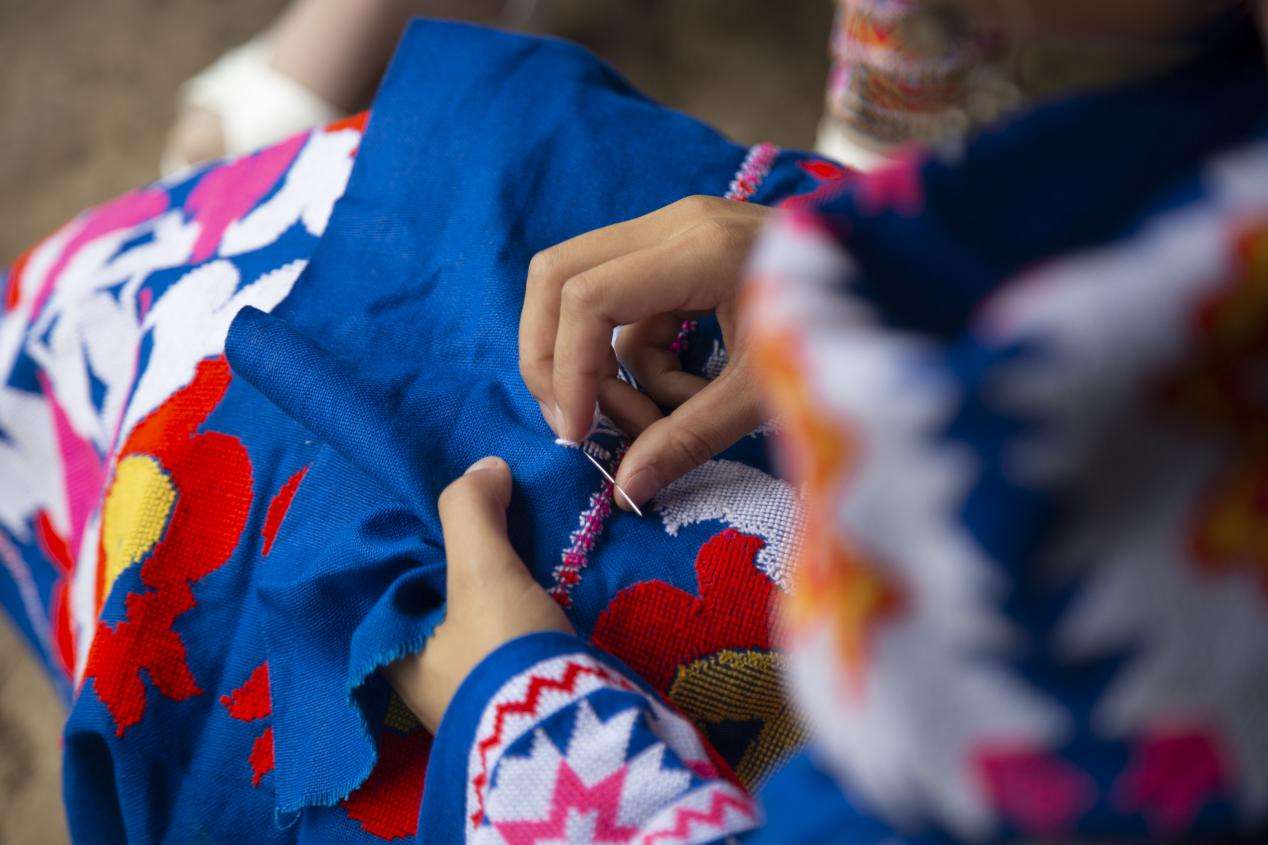 苗族的傳統服飾出自本民族婦女的雙手,服飾中的刺繡是制作工序當中最為復雜的一項。閑暇時分,苗族婦女三五成群,坐著故居前,伴著習習涼風刺繡。刺繡圖案的多少和優美與否,在一定程度上,標識了苗族婦女的勤勞能干,所以壩樓村苗族婦女的刺繡圖案復雜多變,集優美與實用一體。刺繡是苗族源遠流長的手工藝術,是苗族服飾主要的裝飾手段,是苗族女性文化的代表。苗族刺繡借助色彩的運用、圖案的搭配,達到視覺上的多維空間。其中挑花也稱數紗繡,是苗族特有的技藝,不事先取樣,利用布的經緯線挑繡,反挑正取,形成各種幾何紋樣。