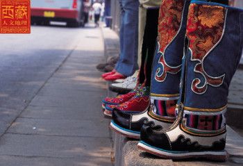 西藏高原地域遼闊,每個地區都有屬于自己的鞋子。藏族男女鞋,外觀雖然很像舞臺上古裝戲里穿的靴子,但用牛皮做底,底高二寸,腰高至小腿之上,鞋面用紅綠相間的毛呢裝飾,鞋腰也有線條、花紋,鞋幫用各色絲線或各色皮革、氆氌、金絲緞制成。人們能從一個人所穿的鞋子判斷出一個人的職業和社會階層。