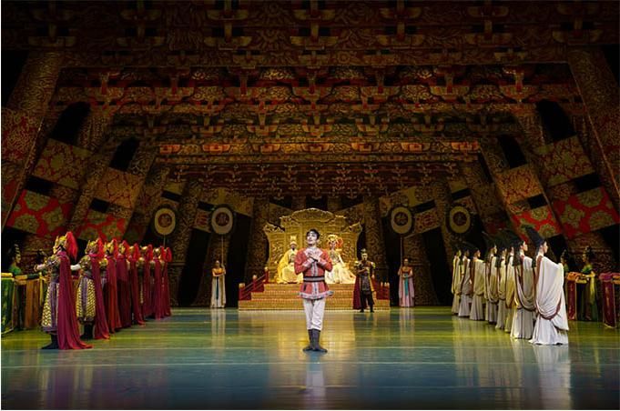 舞劇《傳絲公主》以蠶絲為戲劇元素,以蠶桑女寧兒與于闐王子尉遲的愛情為外在線索,以盛唐時中原與西域的交流往來為隱伏線索,將凄美的愛情故事與壯闊的家國情懷交織在一起,引領觀眾穿越到大唐盛世,感受繁興的絲路文化和豐富多彩的民族風情。