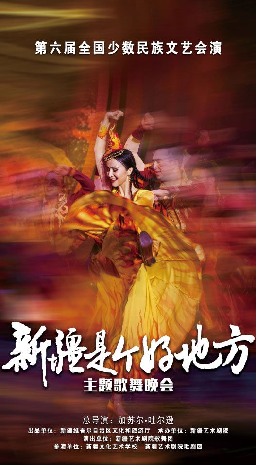 9月11日,由新疆維吾爾自治區文化和旅游廳策劃指導,新疆藝術劇院統籌打造,新疆藝術劇院歌舞團創作的主題歌舞晚會《新疆是個好地方》亮相第六屆全國少數民族文藝會演,在央視網和國家民委門戶網站進行展播,向全國觀眾講述了多彩的新疆、團結的新疆、大美的新疆。