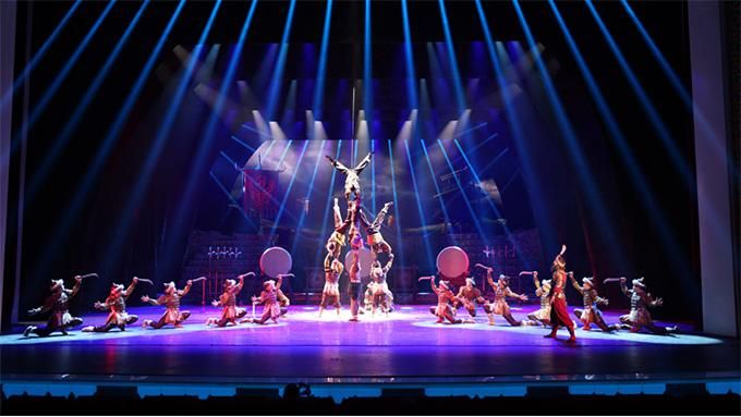 雜技是這部劇的一大亮點。新疆生產建設兵團雜技團近年來編創了《天鵝湖—男子倒立技巧》《向太陽—繩技》《春之韻—女子造型》等多個精品節目,并在國內外重大雜技賽場多次獲獎。《樓蘭尋夢》中,主創團隊將這些獲獎節目進行拆解,將蹬鼓、獨輪車、吊環、肩上芭蕾、水流星及舞中幡等雜技技巧與戲劇元素相融合,讓觀眾猶如置身于黃沙漫漫的絲路古國。