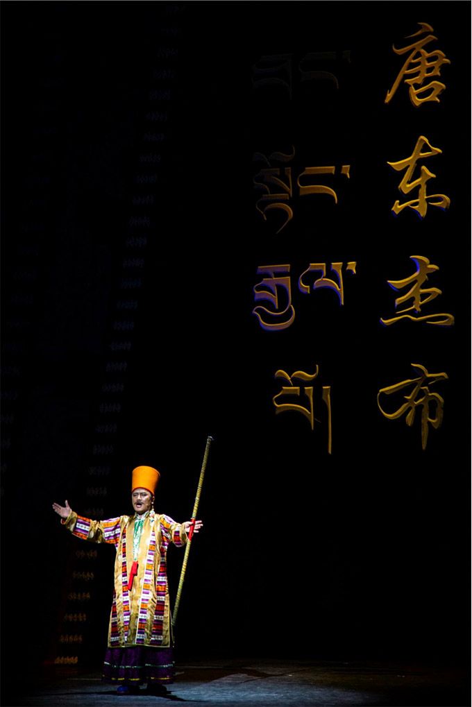 《唐東杰布》是對(duì)安多南木特藏戲的豐富和拓展。南木特藏戲被列入聯(lián)合國人類口頭與非物質(zhì)文化遺產(chǎn)名錄和國家級(jí)非物質(zhì)文化遺產(chǎn)項(xiàng)目,在甘肅、青海、四川的藏族聚居區(qū)有著非常廣泛的文化影響力和群眾基礎(chǔ),被人們稱為“百年南木特”。由于文化傳統(tǒng)向心力的吸引,南木特藏戲在安多藏族聚居區(qū)有著不可替代的宣傳教育功能。但進(jìn)入新世紀(jì)以來,南木特藏戲的劇目創(chuàng)新沒有跟上時(shí)代的步伐。群眾雖然習(xí)慣于傳統(tǒng)劇目的藝術(shù)享受,但同時(shí)又渴望新的劇目誕生,藏戲工作者在完成繼承工作的同時(shí),又面臨劇目創(chuàng)新、手段創(chuàng)新的問題。