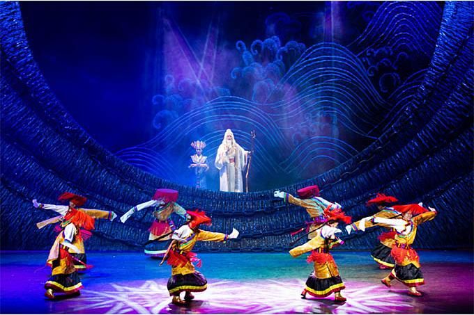 因此,創(chuàng)作伊始,主創(chuàng)人員就充分考慮劇目創(chuàng)新和手段創(chuàng)新。在劇目創(chuàng)新上,編劇選擇了唐東杰布這一藏族聚居區(qū)家喻戶曉的歷史人物為戲劇核心人物,極大地提高了觀眾的關(guān)注點(diǎn)。又因?yàn)樘茤|杰布本人就是藏戲的創(chuàng)始人,但至今沒有一部表現(xiàn)其事跡的劇目,表現(xiàn)藏戲鼻祖一生偉業(yè)的《唐東杰布》橫空出世,無疑填補(bǔ)了這一空白,成為藏戲在選材上的重大突破。
