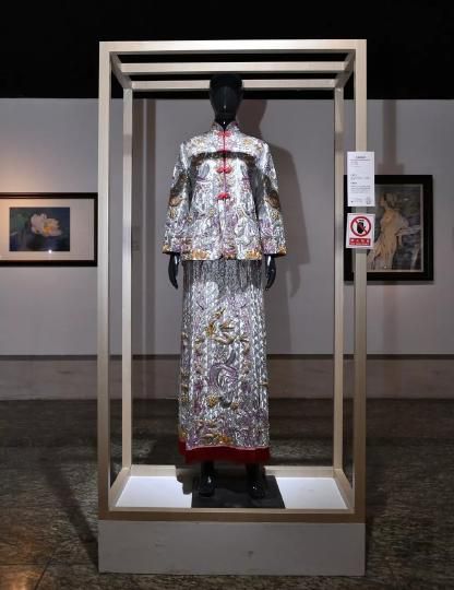 龍鳳褂裙,為女子出嫁與善終之時所穿之物。本作品采用精細金銀線配以潮繡墊高技法,繡制龍鳳圖案多達70余只,成為褂裙等級中的最高規格“褂王”。