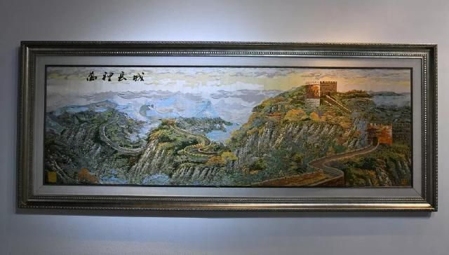 《萬里長城》是金文集數年之功完成的云錦巨制。觀者立于高山之巔,長城從峰巒疊嶂間伸向遠方,更有一旁朝霞相伴,使畫面錯落有致,層次豐富。