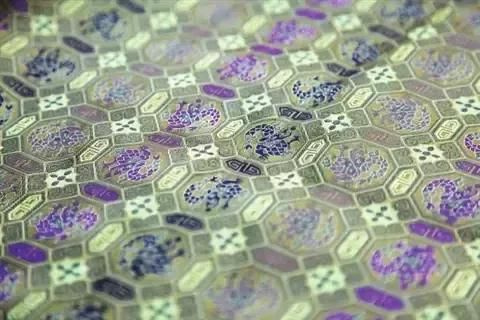菱格四合如意紋錦根據民間收藏家手中的傳世品復制,通過分析測試原作的花紋色彩、絲線材料、織物結構及加工工藝,并采用手工彩拋換道,使整匹面料的色彩千變萬化。