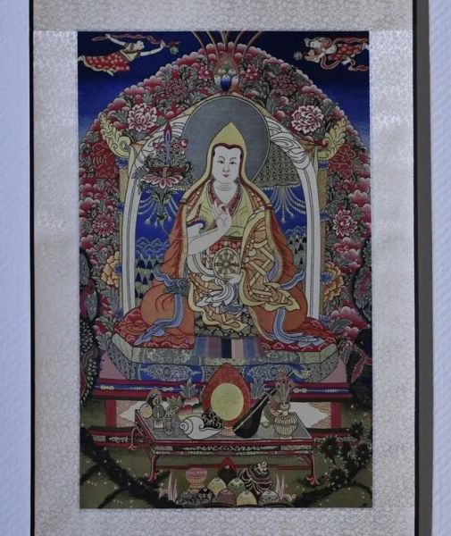 本作品的主體是藏傳佛教格魯派創始人宗喀巴。豐富的層次,飽滿的花紋,使其成為獨具風格的高檔全真絲宋錦唐卡。