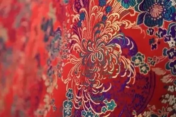 南京云錦大量使用金線,逐花異色,質地堅實,花紋渾厚優美,色彩濃艷莊重。配色運用 “色暈 ”層層推出主花,且從云錦的不同角度觀察,繡品上花卉的色彩是不同的。