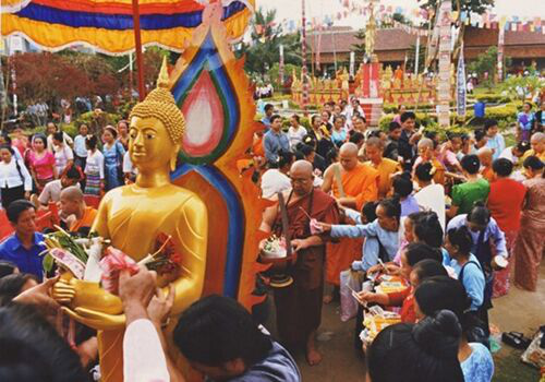 新年潑水是一種禮節(jié),既隆重又熱鬧。除夕那天,人們先到佛寺里,取來最干凈的清泉(江河)水,采來最香的鮮花,把花瓣撒在水中,每人取一瓢,用含著花香的清水給佛像沐浴(象征給佛祖沐浴),祈求來年平安。儀式舉行完后,人們用樹枝和鮮花浸水相互淋灑,以示祝福,口中不斷地說著“薩瓦沙麗”(吉祥安康)“如利京宛”(幸福健康)。對(duì)長(zhǎng)者只能輕輕地淋灑在肩和背上,表示尊重。到佛寺外和街上,年輕人們就可以潑水狂歡,以示祝福和歡樂。