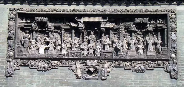 廣東磚雕按技法分淺浮雕、高浮雕和透雕,按規模分組合磚雕(先單個注模,然后組合成一個完整的圖案)和單塊磚雕。組合磚雕一般用于墻頭、柱頭、照壁等大面積的裝飾,大者需數百塊磚雕組成。單塊磚雕則常鑲嵌于神龕邊框或相飾、座飾等處。