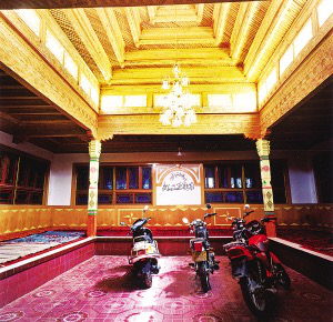 和田的“阿以旺”民居。和田地處塔克拉瑪干沙漠的南部,冬冷夏熱,干旱少雨風又大,蒸發量是降雨量的幾十倍。為了適應氣候,維吾爾人創造了平頂土房,房內居室分冬室和夏室兩部分。在維語中,“夏室”又稱“阿以旺”,建筑前面的外廊,其地面高出院落地面近一米,形如土炕,鋪氈毯,是每年5 ~ 11月份日常生活、待客的主要場所,晚間鋪被褥即可睡覺。設天窗側向采光