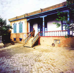 維吾爾族的傳統民居以土坯建筑為主,多為帶有地下室的單層或雙層拱式平頂,農家還用土胚塊砌成晾制葡萄干的鏤空花墻的晾房。住宅一般分前后院,后院是飼養牲畜和積肥的場地,前院為生活起居的主要空間,院中引進渠水,栽植葡萄和杏等果木,院內有用土塊砌成的拱式小梯通至屋頂,梯下可存物,空間很緊湊。
