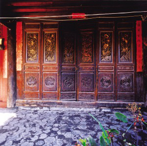 云南大理市綠桃村“三坊一照壁”民居堂屋六扇木門的雕刻。院內廈廊和正房的格子門,一般由6扇組成,每扇門又分隔成5塊木板,每塊木板都是透雕和浮雕相結合的木雕。分別雕刻著“雙鳳朝陽、二龍搶寶、八仙過海、喜鵲登梅、漁樵耕讀、六合同春”的吉祥圖案,刀法嫻熟,輪廓清晰,形象生動,一個院落就是一個木雕藝術畫廊。此外,窗上有通透的花格,下部檻墻做成木質裙板。