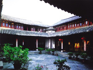 云南大理市喜州“四合五天井”院落。白族將一幢三開間二層的房屋稱為“一坊房子”。一坊房子是普通百姓最常見的住房,即底層三間一明兩暗,明間為堂屋,安設六扇花格門。兩側次間為臥室,設單扇門和格扇窗,前面有臺階和寬敞的廈廊。樓上三間敞通,一般不隔間,依房柱分區域,面對天井設格扇窗。中間明間靠后墻設神龕,里間當書房,放書柜和書桌,人口多的也放床當臥。