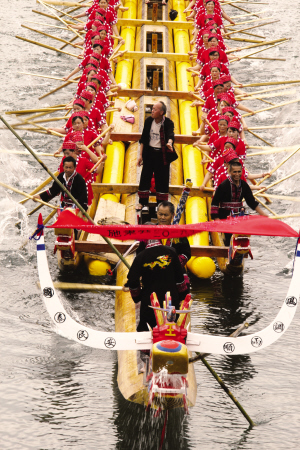 “苗族第一龍舟”全長77.8米,寬2.5米,整舟由一條主舟與兩條子舟組合而成,主舟居中,子舟為輔船,組裝在主舟左右兩側,兩條子舟分別長58米。整船可承載槳手160人,舵手、鼓手、鑼手等共20人,總計180人。