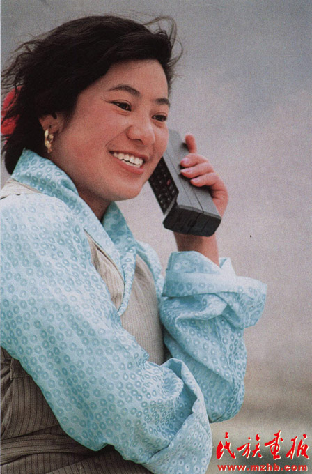 1995年,一位藏族婦女使用移動電話聯系業務。這一年除青海省外,全國各省區都開通了移動電話業務,極大地方便了群眾的聯絡與溝通。《民族畫報》2008年第12期
