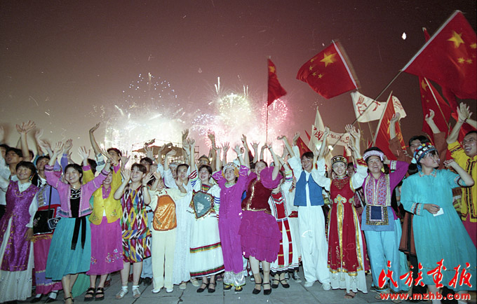 1997年7月1日零點,中華人民共和國國旗和香港特別行政區區旗在香港升起,經歷了百年滄桑的香港回到祖國的懷抱,中國政府開始對香港恢復行使主權。香港回歸祖國,舉國上下一片歡騰。各族人民以隆重而熱烈的方式,歡呼五星紅旗在香港特別行政區高高飄揚。圖為首都各民族學生熱烈慶祝香港回歸?!睹褡瀹媹蟆?997年第9期