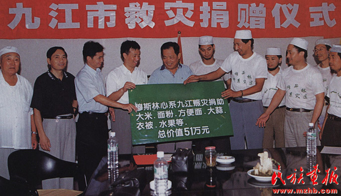 1998年,長江發生了全流域的特大洪水,災情牽動著全國各族人民的心,舉國掀起了“情系災區、奉獻愛心”的賑災熱潮。圖為回族企業代表在江西省九江市政府舉行捐贈儀式?!睹褡瀹媹蟆?998年第12期