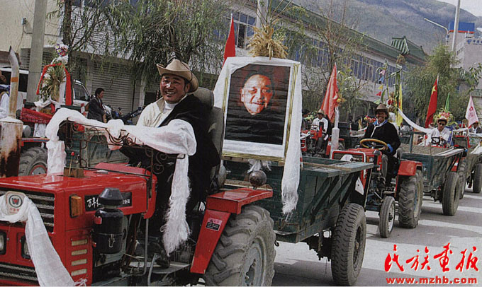 2004年8月21日,西藏山南地區乃東縣的農牧民高懸鄧小平畫像,開著拖拉機在山南街頭巡游,表達對改革開放總設計師鄧小平同志的深切緬懷。改革開放后,西藏自治區農牧民的年人均收入已從改革開放初期的幾百元上升至2004年的2000元左右,西藏城鎮居民年收入則超過7000元,位居西部前列?!睹褡瀹媹蟆?008年第12期