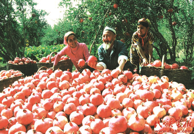 興邊富民行動是1999年中央民族工作會議部署的一項重要的邊境建設工程,旨在“富民、興邊、強國、睦鄰”。興邊富民行動為新疆的發展帶來了實惠,2006年,看著豐收的石榴,維吾爾族農民樂開了花。《民族畫報》2007年7期