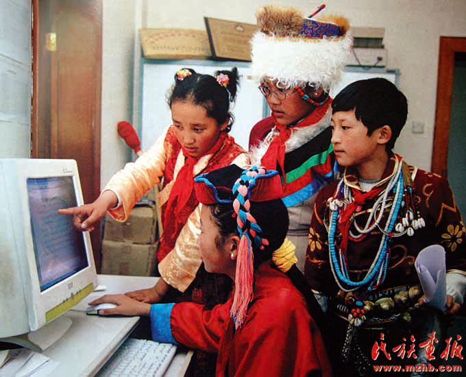 曾幾何時,電腦、網絡等現代化的交流手段離邊疆少數民族地區那么遙遠,隨著經濟發展、國民消費水平的提高,一些高科技、現代化的事物在普通群眾中輕而易舉地普及了。圖為2007年,西藏門巴族、珞巴族的兒童在學電腦。(中國民族圖片庫資料)