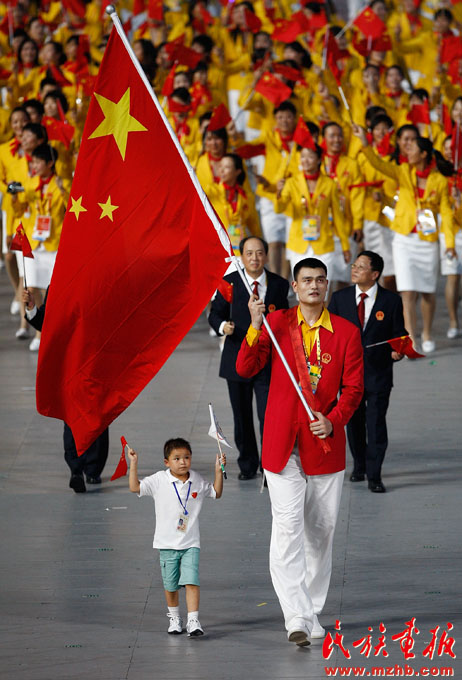 2008年8月8日,全國各族人民期盼已久的第二十九屆奧林匹克運動會在北京隆重開幕,圖為北京奧運會中國代表團入場儀式上,運動員姚明領著汶川大地震中最小的救人英雄林浩入場?!睹褡瀹媹蟆?008年第9期