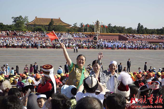 新中國成立以來,黨和國家始終堅持把馬克思主義民族理論同中國民族問題具體實際相結合,始終堅持把民族工作作為一項重大工作來抓,團結帶領全國各族人民共同團結奮斗,共同繁榮發展,開創了中國特色解決民族問題的正確道路,取得了舉世矚目的成就,積累了彌足珍貴的成功經驗。2009年10月1日,在北京天安門廣場,20萬軍民以盛大的閱兵儀式和群眾游行歡慶新中國60華誕,圖為各民族學生參加“團結奮進”方陣群眾游行?!睹褡瀹媹蟆?009年第10期
