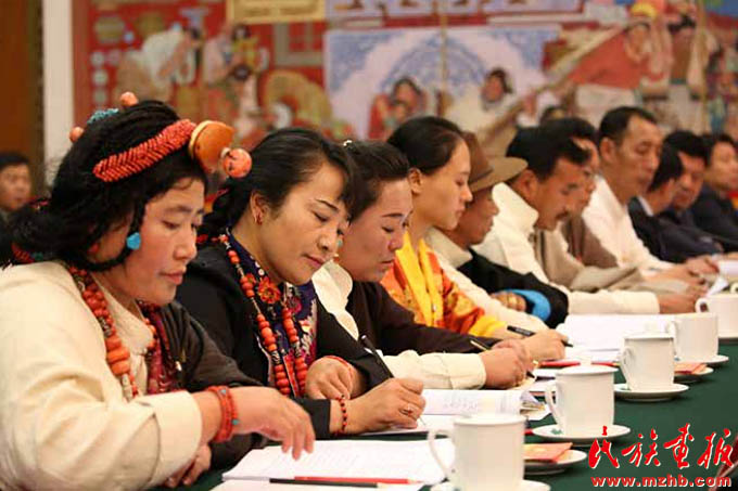 2017年10月18日,在中國共產黨第十九次全國代表大會上,習近平鄭重宣示:“經過長期努力,中國特色社會主義進入了新時代,這是我國發展新的歷史方位?!笔糯髨蟾嬷?,習近平用五句話深刻揭示了新時代的內涵,指出這個新時代,是承前啟后、繼往開來、在新的歷史條件下繼續奪取中國特色社會主義偉大勝利的時代,是決勝全面建成小康社會、進而全面建設社會主義現代化強國的時代,是全國各族人民團結奮斗、不斷創造美好生活、逐步實現全體人民共同富裕的時代,是全體中華兒女勠力同心、奮力實現中華民族偉大復興中國夢的時代,是我國日益走近世界舞臺中央、不斷為人類作出更大貢獻的時代。圖為席黨的十九大的西藏自治區代表團代表在討論十九大報告?!睹褡瀹媹蟆?017年第11期