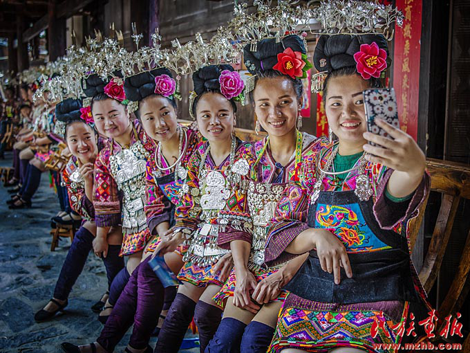 經歷改革開放40年的發展,我國社會生產力、綜合國力、人民生活水平實現了歷史性跨越,全黨全國各族人民要更加緊密地團結在以習近平同志為核心的黨中央周圍,高舉中國特色社會主義偉大旗幟,不忘初心,牢記使命,將改革開放進行到底,不斷實現人民對美好生活的向往,在新時代創造中華民族新的更大奇跡。圖為貴州民眾盛裝自拍?!睹褡瀹媹蟆?018年第3期