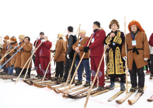 在今年的慶祝活動上,當地好客的各族群眾身著傳統服飾,載歌載舞。手拿單杖、腳踏毛皮滑雪板的小伙兒,與腳踩現代雪板、手持雙杖的小伙兒并排站立,分外搶眼。