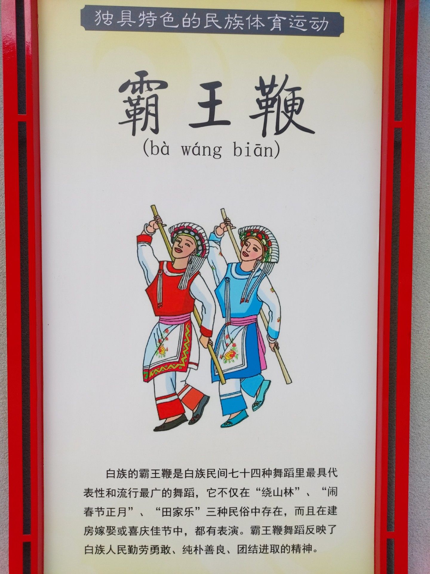 白族的霸王鞭是白族民間七十四種舞蹈里最具代表性和流行最廣的舞蹈,它不僅在“繞山林’”、“鬧春節正月”、“田家樂” 三種民俗中存在,而且在建房嫁娶或喜慶佳節中,都有表演。霸王鞭舞蹈反映了白族人民勤勞勇敢、純樸善良、團結進取的精神。