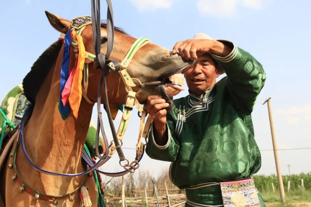 馬的交叉行走分為兩種。一般情況下,馬的右前腿和左后腿同時往前走,左前腿和右后腿并前行叫作“通西業”;左前腿和后腿并行或右前腿和后腿并行叫作“走馬式行走”。走馬分為賽布日吉擾、海日查格吉擾、德古日吉擾、塔拉吉擾、胡日頓吉擾等5種。小走是走馬中最簡單的行走方式,不費多大力氣。海日查格吉擾是在小走的基礎上稍微快一點兒的行走方式,這是馬天生的步式之一。德古日吉擾是在賽布日吉擾和海日查格吉擾的基礎上訓練出來的走馬步式。把這種步式再加訓練,比之前稍快,達到能進入賽場的程度時就稱為塔拉吉擾。馬的塔拉吉擾還存在于訓練階段,只有經過進一步的訓練才能使馬的四肢之間的距離保持均衡,成為胡日頓吉擾(快走馬)。