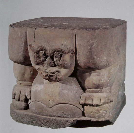 圓雕,白砂石質,近似正方體。圓雕男性人像,面部渾圓,顴骨高突,粗眉上翹,雙目圓睜且外突,鼻梁短粗,獠牙外露,下頜置于胸前,裸體,腹有肚兜,肩于頭齊,肘部后屈,雙手扶膝,下肢屈跪,背部平直。座頂左上角陰刻西夏文三行,計15個字。第一行4字漢譯為“小蟲曠負”;第二行4字漢譯為“志文支座”;第三行7字漢譯為“瞻行通雕寫流行”。背部陰刻漢文一行6字“砌壘匠高世昌”,為西夏石雕工匠的姓名,彌足珍貴。雕像以夸張的手法表現了負重者的神態,反映出西夏時期石雕藝術的獨特風格。迄今在西夏陵區多座帝陵的碑亭遺址中,已出土這類支座14件,但刻有西夏文字的僅此一件。