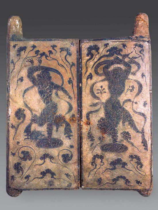 每扇門均呈長方形,上下有圓柱狀榫,兩門閉合處各有一孔,出土時有鐵鎖鎖扣。每扇石門正中淺雕一“胡旋舞”男伎。所刻男伎為典型的胡人形象:虬髯卷發,深目高鼻,寬肩細腰,體魄健壯。身著圓領緊身窄袖衫,下著緊腿裙,腳穿長筒皮靴,站立在一塊編織精美的小圓毯上,雙人對舞。舞姿造型略有不同,左邊舞伎側身回首,左腳站立圓毯上,右腿后屈,左手正微微上舉,右臂屈至頭頂;右側男伎右腳立毯上,左腿前伸,雙臂上屈,至頭頂上方合攏。兩人均手舉長巾,熟練揮旋。四周剔地淺浮雕卷云紋,似舞伎騰躍于云氣之中,造成流動如飛的藝術效果。整個畫面構思精妙,主題突出,人物面部表情生動自然,體態輕盈健美,舞姿迅疾奔放、充滿歡樂生活氣息。