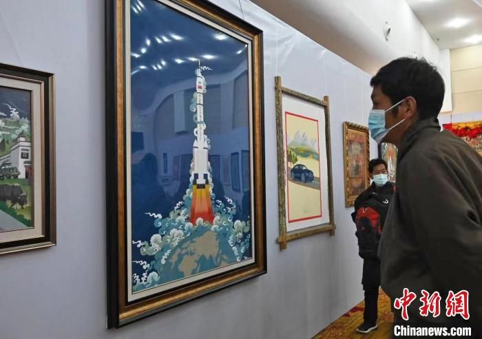邊巴是作品《一飛沖天》的作者,這位畫師從1979年從事唐卡繪畫至今。他說,該作品以神舟十三號為主題,描繪了飛船沖出地球奔向星辰大海的瞬間。采用勉唐派唐卡繪畫語言和傳統礦植物顏料。同時融合了漢藏審美視角,立足于中國放眼世界的人類命運共同體胸懷,嘗試新時代新唐卡新融合的藝術表達。