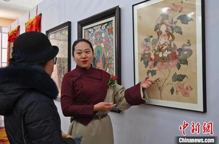 王天文是該協會為數不多的女性,自幼學習國畫。此次她的展出作品《花與佛》進行了唐卡創新,將漢地工筆繪法的花卉與唐卡白度母形象融合。因為熱愛藏文化,2011年她從家鄉河北到西藏學習唐卡,希望能探索唐卡與不同繪畫種類方式的結合。