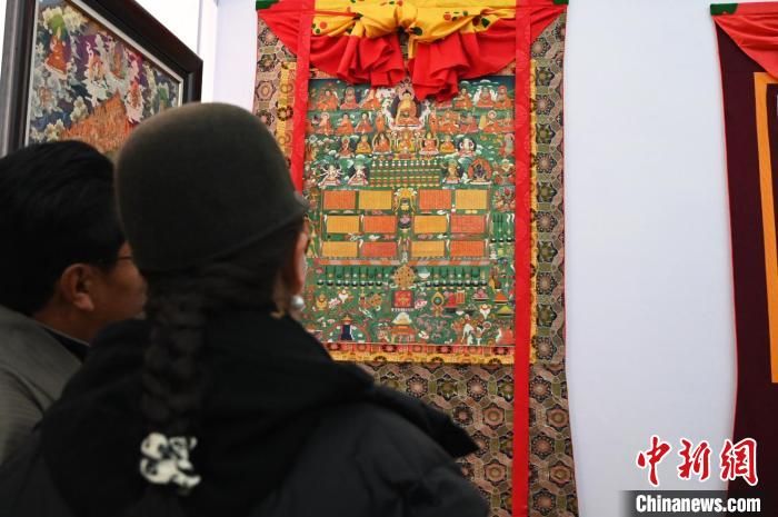 圖為唐卡愛好者欣賞唐卡展品。 趙朗 攝