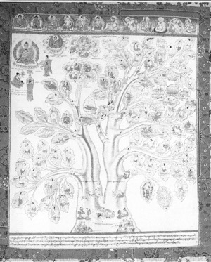 藏族“湯卡”的繪制有一個特點,就是不注明繪制日期或繪制人的姓名(除個別的“曼湯”外),但藏族“曼湯”卻另有特點,就是在“曼湯”的最上方留有一定位置來繪制醫學中的重要人物,特別是古代醫學家。藏族古代醫學家往往也是宗教人物。