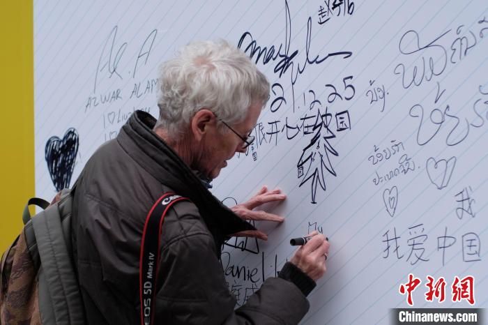 一名外國友人參觀畫展,并簽名。 劉俊聰 攝