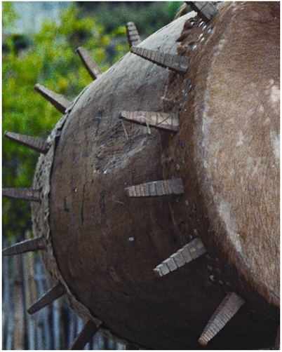 民族文化宮博物館藏基諾族木質(zhì)皮鼓,鼓面直徑55厘米,高88厘米,長約130厘米,20世紀(jì)八十年代征集于云南省西雙版納州景洪縣基諾鄉(xiāng)。鼓身為木質(zhì),呈圓柱形,兩端對稱。鼓有兩面,用牛皮蒙制。兩端鼓面邊緣各環(huán)繞嵌有花紋的上方下錐形的木棍(一側(cè)17根,另一側(cè)為20根),木棍長15厘米。鼓身兩側(cè)有方形孔,為鼓的音孔,上部有兩個(gè)把手,用于系繩懸掛木鼓。因鼓面兩端邊沿嵌有數(shù)十根鼓釘,形似太陽放射出的光芒,也稱為“太陽鼓”。