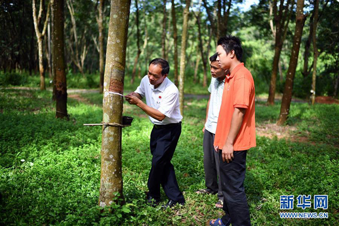 羊風(fēng)極(左)在海南省白沙黎族自治縣打安鎮(zhèn)田表村指導(dǎo)年輕人割膠