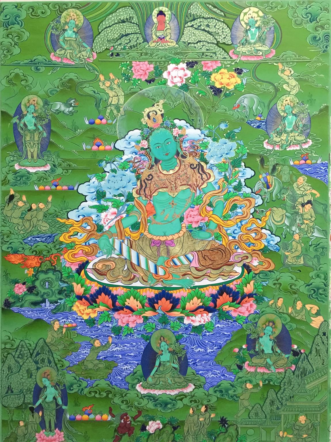 綠度母即觀世音菩薩之化身,為二十一度母之主尊,持通本尊咒,能總持二十一度母之功德。修持此尊密法,能斷生死輪回,消除一切魔障、業障,并能消災增福,延壽廣開智能,凡有所求無不如愿成就,且命終往生極東世界。唐朝的文成公主咸信是綠良母的化身。