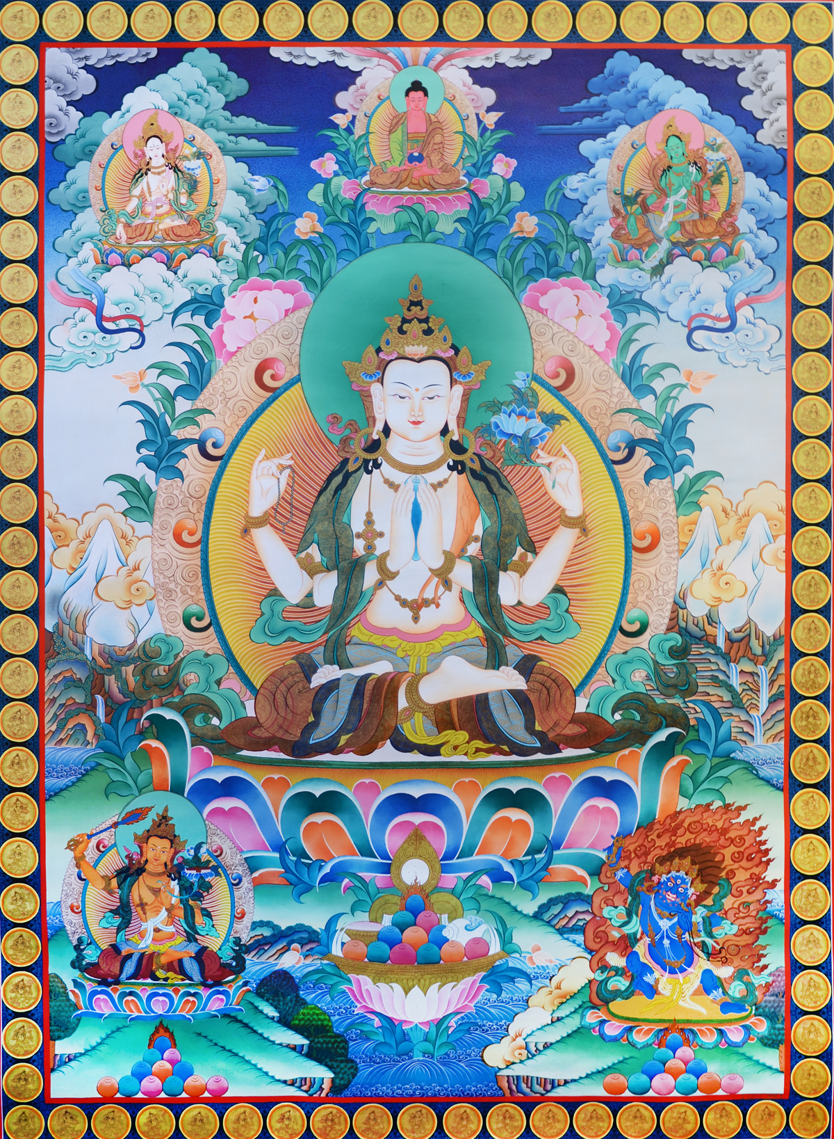 四臂觀音是雪域西藏的守護神,藏人由老至幼家家戶戶,皆吟誦其六字大明咒:“嗡嘛呢叭咪吽”。四臂觀音輿文殊菩薩、金剛手菩薩,合稱三族姓尊.代表大悲、大智、大力,為密乘行者人人必修的法門。