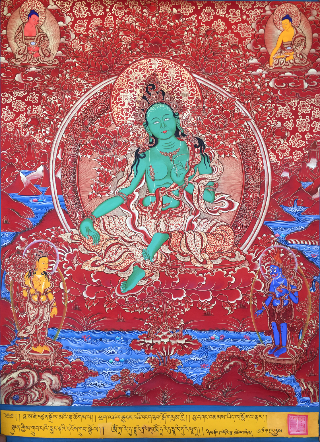 綠度母即觀世音菩薩之化身,為二十一度母之主尊,持通本尊咒,能總持二十一度母之功德。修持此尊密法,能斷生死輪回,消除一切魔障、業障,并能消災增福,延壽廣開智能,凡有所求無不如愿成就,且命終往生極東世界。唐朝的文成公主咸信是綠良母的化身。