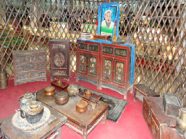 亞洲游牧、游獵民族創造的移動式民居,在其發展過程中形成了兩大流派:一種是中國鄂倫春人的傳統建筑歇仁柱式(在鄂倫春語里歇仁柱為“木桿屋”之意),即尖頂、用獸皮或樹皮、草葉子做苫蓋。另一種是蒙古包式的,即穹頂圓壁,主要用毛氈做其覆蓋物。蒙古包的包門開向東南,既可避開西伯利亞的強冷空氣,也沿襲著以日出方向為吉祥的古老傳統。而帳內的中央部位,安放著高約二尺的火爐。火爐的東側放著堆放炊具的碗櫥,火爐上方的帳頂開有一個天窗。火爐西邊鋪著地氈,地氈上擺放矮腿的雕花木桌。包門的兩側懸掛著牧人的馬鞭、弓箭、獵槍以及嚼轡之類的用具。帳內的西側擺放著紅漆彩繪木柜,木柜的北角上敬放著佛龕和佛像,佛像前供放著香爐及祭品。